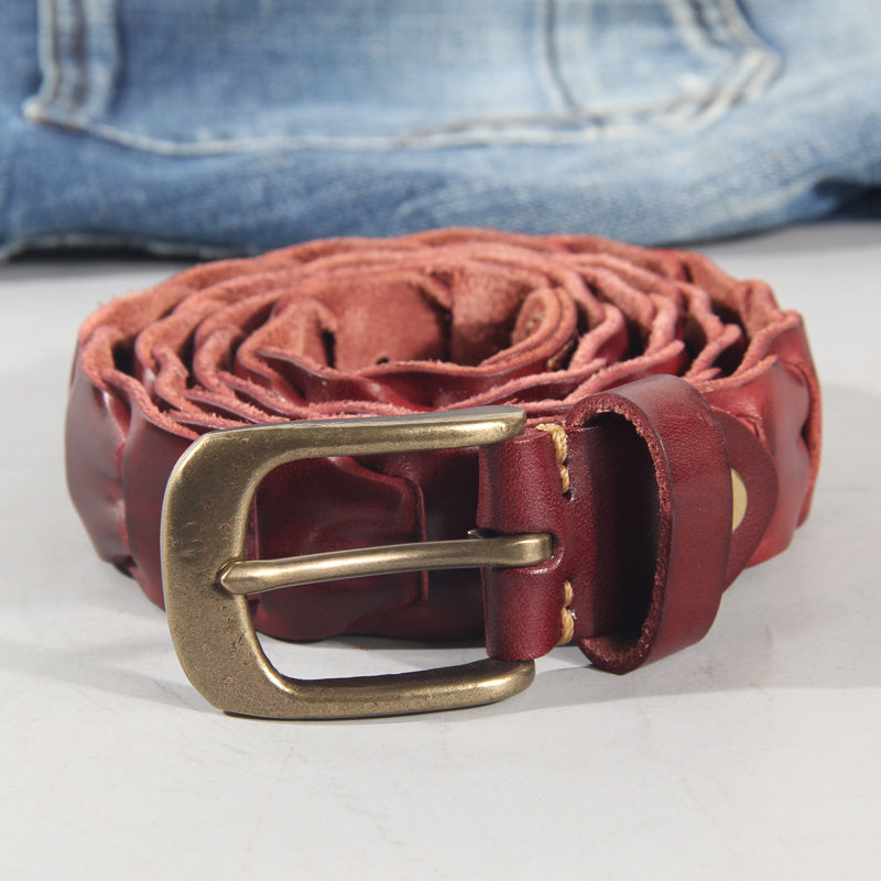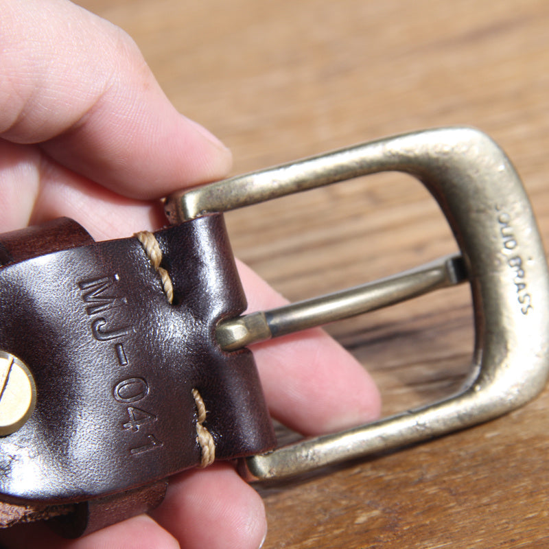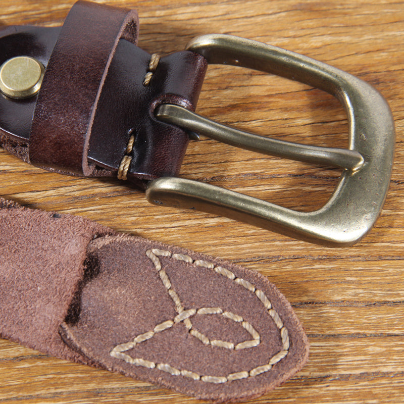 Unisex first-layer cowhide leather belt with glossy finish and thick line decoration. Designed in casual denim style with a durable copper pin buckle. Perfect for everyday wear.